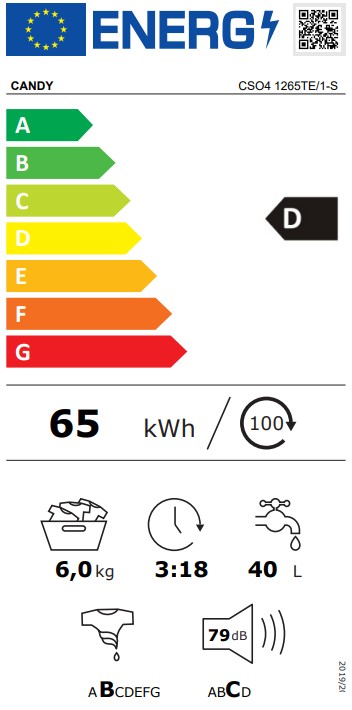 Ta pralka, zgodnie z nową etykietą energetyczną, jest urządzeniem klasy D i w porównaniu z klasą G, ma mniejsze zużycie prądu o co najmniej 24%, dzięki czemu możesz zaoszczędzić pieniądze i dbać o środowisko.