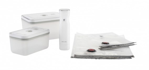 Zestaw składa się z pompy próżniowej, dwóch torebek próżniowych oraz dwóch pojemników z tworzywa sztucznego w rozmiarach M i L (o pojemności 1.1 ltr oraz 2.3 ltr). Pojemniki próżniowe nadają się do zamrażarki, zmywarki jak i kuchenki mikrofalowej. Torebki, poza tym, że również mogą być stosowane w zamrażarce i mikrofalówce, doskonale sprawdzą się w temperaturze do 100°C do gotowania sous-vide. Dla jeszcze większego komfortu elementy zestawu wyposażono w połączone z darmową aplikacją ZWILLING Culinary World kody QR. Dzięki temu na bieżąco można kontrolować świeżość i przydatność przechowywanych dań, a tym samym uniknąć nadmiernego wyrzucania żywności. Aplikacja umożliwia jednak nie tylko: dostępne tam przepisy sprawią, że codzienne posiłki staną się prawdziwą ucztą.